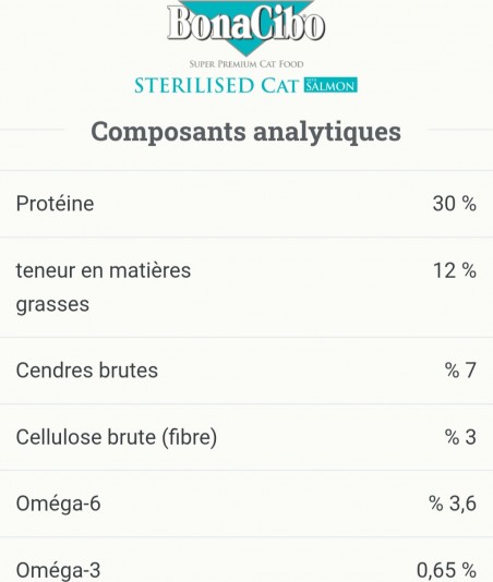BonaCibo Sterilised Cat with Salmon est un aliment super premium conçu pour les chats adultes stérilisés. Sa formule au saumon aide à maintenir un poids idéal, soutient la santé urinaire et favorise une digestion saine. Il offre une nutrition complète pour le bien-être quotidien de votre chat.
